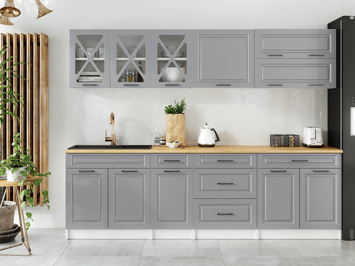 Kuchyňská linka Tyra je vyrobená ve velmi oblíbeném skandinávském stylu, který se hodí do kuchyně v paneláku i v rodinném domě. Tento styl má jedinečnou schopnost proměnit Vaši kuchyň v útulnou a zároveň funkční místnost, kde bude radost vařit i péct. Kuchyňská linka Tyra nabízí dostatek úložného i pracovního prostoru. Všechny skříňky jsou samostatné, takže si je můžete sestavit tak, jak Vám to vyhovuje. Korpusy skříněk jsou vyrobené z lamina 18 mm s hranami ABS a dvířka jsou MDF 16mm. Všechny skříňky jsou dodávány v demontu. Součástí balení je montážní plánek včetně všech potřebných spojovacích materiálů. Cena je uvedena za sestavu vyobrazenou na úvodní fotografii BEZ PRACOVNÍ DESKY, s úchytkami, které jsou vyobrazeny v doplňkových fotografiích. Pracovní desku lze dokoupit nad každou skříňku zvlášť podle její šíře. Vyobrazené spotřebiče, dřez, baterie, doplňky a dekorace nejsou v ceně. Zobrazení barev na fotografii se může od skutečnosti lišit. Správný odstín šedé barvy je zobrazen v doplňkové fotografii.