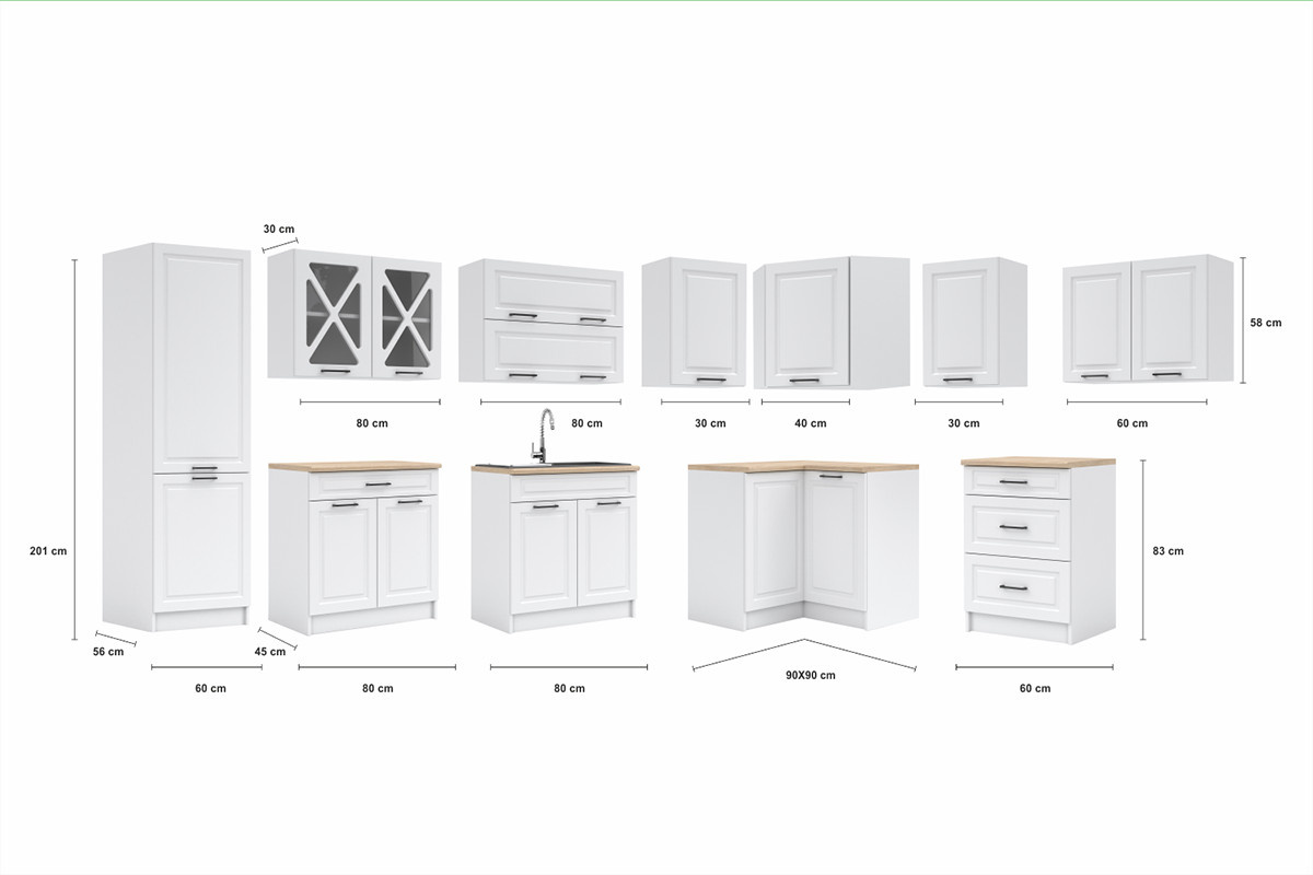 Kuchyňská linka Simea je vyrobená v populárním skandinávském stylu, který se hodí do kuchyně v paneláku i v rodinném domě. Tento styl má jedinečnou schopnost proměnit Vaši kuchyň v útulnou a zároveň funkční místnost, kde bude radost vařit i péct. Rohová kuchyňská linka Simea nabízí dostatek úložného i pracovního prostoru. Kuchyňské skříňky jsou samostatné, takže si je můžete sestavit podle potřeby tak, jak Vám to vyhovuje. Korpusy skříněk jsou v bílé barvě, vyrobené z lamina tloušťky 18 mm s hranami ABS a dvířka jsou MDF 16mm. Všechny skříňky jsou dodávány v demontu. Součástí balení je montážní plánek včetně všech potřebných spojovacích prvků. Cena je uvedena za sestavu vyobrazenou na úvodní fotografii BEZ PRACOVNÍ DESKY, s úchytkami, které jsou vyobrazeny v doplňkových fotografiích. Pracovní desku lze dokoupit nad každou skříňku zvlášť podle její šíře. Vyobrazené spotřebiče, dřez, baterie, doplňky a dekorace nejsou v ceně. Zobrazení barev na fotografii se může od skutečnosti lišit.
