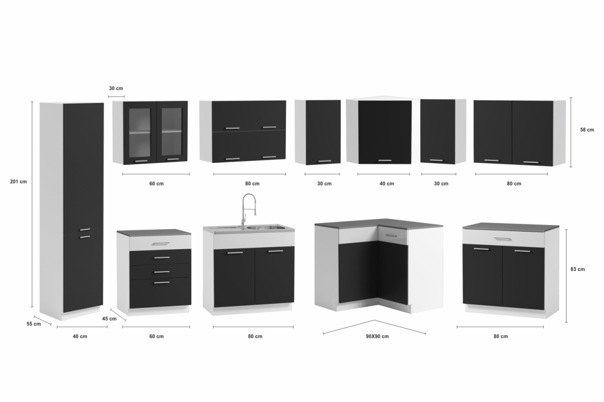 rohová skříňka 80x80 cm, v.83 cm Skutečný rozměr skříňky bez pracovní desky je 80x80 cm/ výška 83 cm, s pracovní deskou je rozměr 90x90 cm. V případě zájmu o dokoupení desky nad tuto skříňku, je potřeba objednat dělenou desku 90 a 30 cm