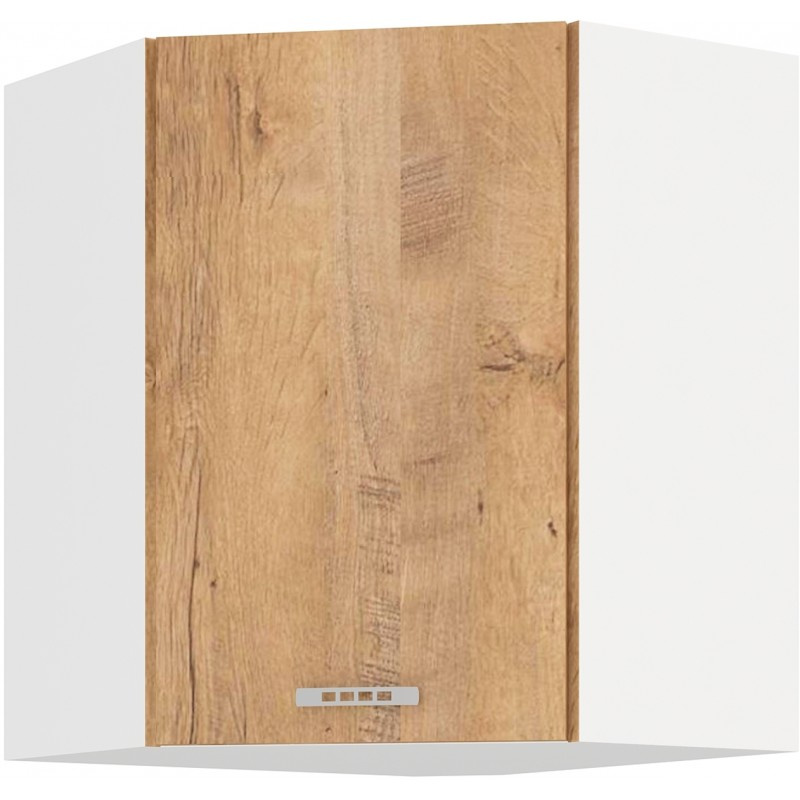 Vrchní rohová kuchyňská skříňka Sally 58x58GN je vyrobena z lamina tloušťky 16 mm bílé barvy a s dvířky v odstínu dub lefkas. Vyberte si z naší nabídky skříněk a vytvořte si kuchyň dle vlastích představ. Může být rohová, rovná, krátká i dlouhá. Fantazii se meze nekladou. V doplňkových fotografiích najdete pro inspiraci fotky kuchyní, které jsou z těchto skříněk sestaveny. Skříňka je dodávaná v demontu. Součástí je montážní plánek včetně všech potřebných spojovacích materiálů.