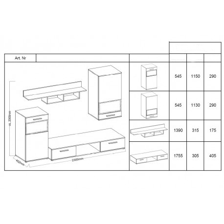 V ceně sestavy je TV stolek, závěsná vitrína, police a skříňka.