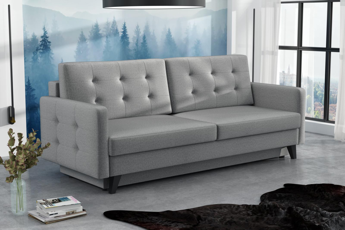 Pohovka Fjord je krásným elegantním kouskem s nádechem RETRO designu a výborně zapadne do každého interiéru. Retro design podtrhují zešikmené dřevěné nohy a látkové knoflíky na opěrce. Pohovka je rozkládací a samozřejmostí je i nepostradatelný úložný prostor. Jednoduchým rozložením pomocí automatu vznikne dostatečně prostorné lůžko k občasnému přespání Vaší návštěvy. Výplň sedáku tvoří vlnité pružiny v kombinaci s pružinami bonell a kvalitní PUR pěnou. Pohovka je celočalouněná, takže ji můžete umístit i do prostoru. Výborně se hodí do obývacího pokoje, do pracovny či pokoje pro hosty. Pohovku nabízíme v několika trendy barvách. Fotografie pohovky v rozkladu jsou pouze ilustrační. Správný barevný odstín je na úvodní fotografii.