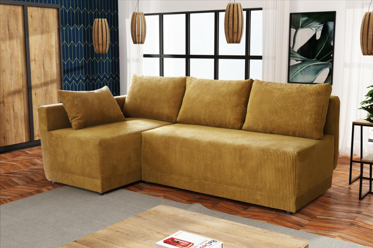 Moderní rohová sedací souprava Vás zaujme svým jednoduchým designem. Součástí jsou polštáře, které dělají sedací soupravu velice pohodlnou. Díky svým rozměrům je vhodná i do menších pokojů. Je praktická, rozklad lze použít k občasnému přespání, plocha lůžka je 198x133 cm. Uvnitř sedací soupravy je úložný prostor, který je možné využít k uložení lůžkovin. Výplň sedáku tvoří pružiny bonell v kombinaci s kvalitní PUR pěnou. Sedací soupravu nabízíme v několika barevných provedeních. Fotografie sedací soupravy v rozkladu jsou pouze ilustrační. Správný barevný odstín je na úvodní fotografii.