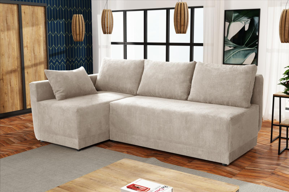 Moderní rohová sedací souprava Vás zaujme svým jednoduchým designem. Součástí jsou polštáře, které dělají sedací soupravu velice pohodlnou. Díky svým rozměrům je vhodná i do menších pokojů. Je praktická, rozklad lze použít k občasnému přespání, plocha lůžka je 198x133 cm. Uvnitř sedací soupravy je úložný prostor, který je možné využít k uložení lůžkovin. Výplň sedáku tvoří pružiny bonell v kombinaci s kvalitní PUR pěnou. Sedací soupravu nabízíme v několika barevných provedeních. Fotografie sedací soupravy v rozkladu jsou pouze ilustrační. Správný barevný odstín je na úvodní fotografii.