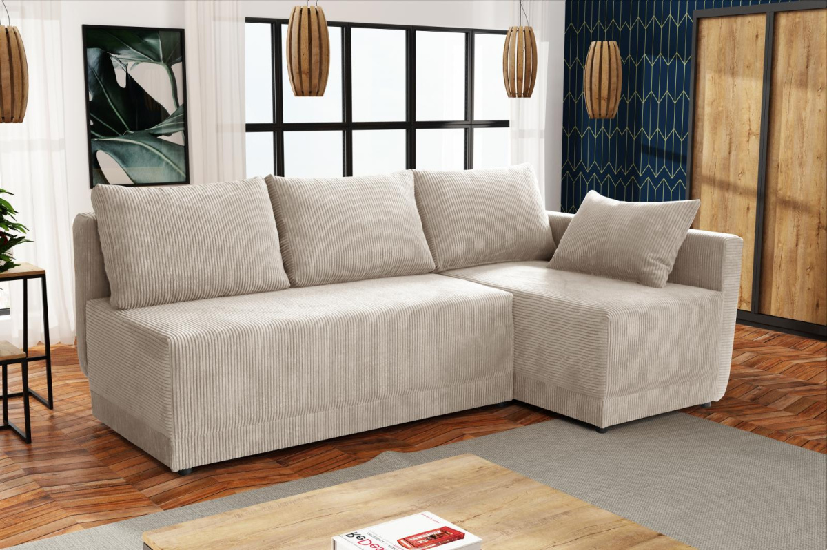 Moderní rohová sedací souprava Vás zaujme svým jednoduchým designem. Součástí jsou polštáře, které dělají sedací soupravu velice pohodlnou. Díky svým rozměrům je vhodná i do menších pokojů. Je praktická, rozklad lze použít k občasnému přespání, plocha lůžka je 198x133 cm. Uvnitř sedací soupravy je úložný prostor, který je možné využít k uložení lůžkovin. Výplň sedáku tvoří pružiny bonell v kombinaci s kvalitní PUR pěnou. Sedací soupravu nabízíme v několika barevných provedeních. Fotografie sedací soupravy v rozkladu jsou pouze ilustrační. Správný barevný odstín je na úvodní fotografii.