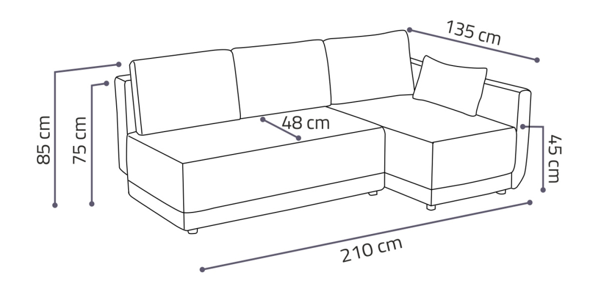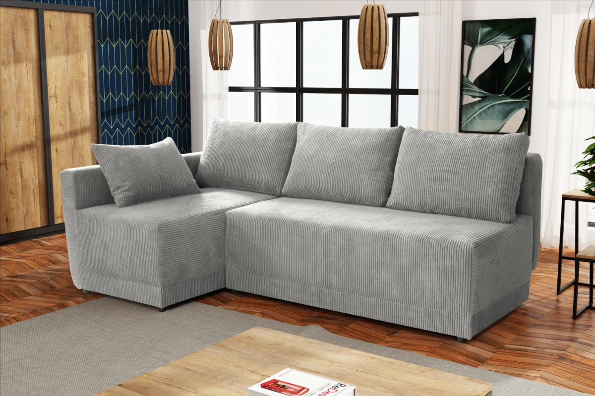 Moderní rohová sedací souprava Vás zaujme svým jednoduchým designem. Součástí jsou polštáře, které dělají sedací soupravu velice pohodlnou. Díky svým rozměrům je vhodná i do menších pokojů. Je praktická, rozklad lze použít k občasnému přespání, plocha lůžka je 198x133 cm. Uvnitř sedací soupravy je úložný prostor, který je možné využít k uložení lůžkovin. Výplň sedáku tvoří pružiny bonell v kombinaci s kvalitní PUR pěnou. Sedací soupravu nabízíme v několika barevných provedeních. Fotografie sedací soupravy v rozkladu jsou pouze ilustrační. Správný barevný odstín je na úvodní fotografii.