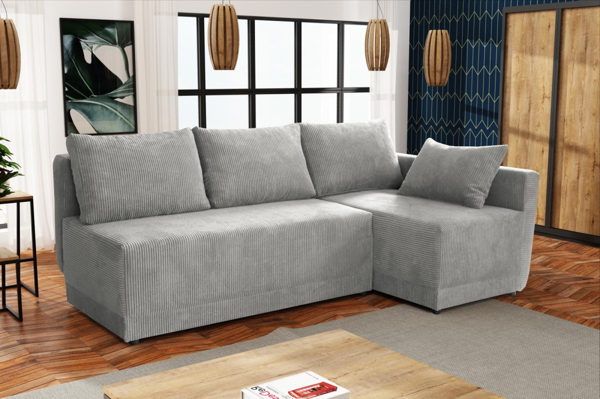 Moderní rohová sedací souprava Vás zaujme svým jednoduchým designem. Součástí jsou polštáře, které dělají sedací soupravu velice pohodlnou. Díky svým rozměrům je vhodná i do menších pokojů. Je praktická, rozklad lze použít k občasnému přespání, plocha lůžka je 198x133 cm. Uvnitř sedací soupravy je úložný prostor, který je možné využít k uložení lůžkovin. Výplň sedáku tvoří pružiny bonell v kombinaci s kvalitní PUR pěnou. Sedací soupravu nabízíme v několika barevných provedeních. Fotografie sedací soupravy v rozkladu jsou pouze ilustrační. Správný barevný odstín je na úvodní fotografii.