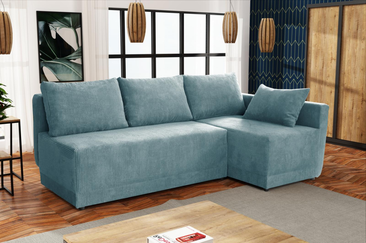 Moderní rohová sedací souprava Vás zaujme svým jednoduchým designem. Součástí jsou polštáře, které dělají sedací soupravu velice pohodlnou. Díky svým rozměrům je vhodná i do menších pokojů. Je praktická, rozklad lze použít k občasnému přespání, plocha lůžka je 198x133 cm. Uvnitř sedací soupravy je úložný prostor, který je možné využít k uložení lůžkovin. Výplň sedáku tvoří pružiny bonell v kombinaci s kvalitní PUR pěnou. Sedací soupravu nabízíme v několika barevných provedeních. Fotografie sedací soupravy v rozkladu jsou pouze ilustrační. Správný barevný odstín je na úvodní fotografii.