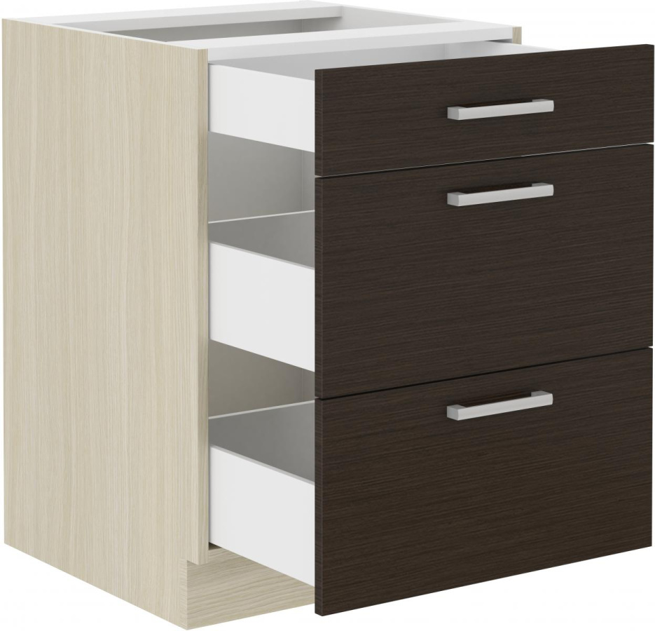 Kuchyňská skříňka Christo 60D3S se 3 zásuvkami je vyrobena z lamina tloušťky 16 mm v odstínu dub ferrara a legno tmavé. Úchytky jsou plastové a jsou v ceně. Vyberte si z naší nabídky skříněk a vytvořte si kuchyň dle vlastích představ. Může být rohová, rovná, krátká i dlouhá. Fantazii se meze nekladou. Skříňka je dodávaná v demontu bez pracovní desky. Součástí je montážní plánek včetně všech potřebných spojovacích materiálů.