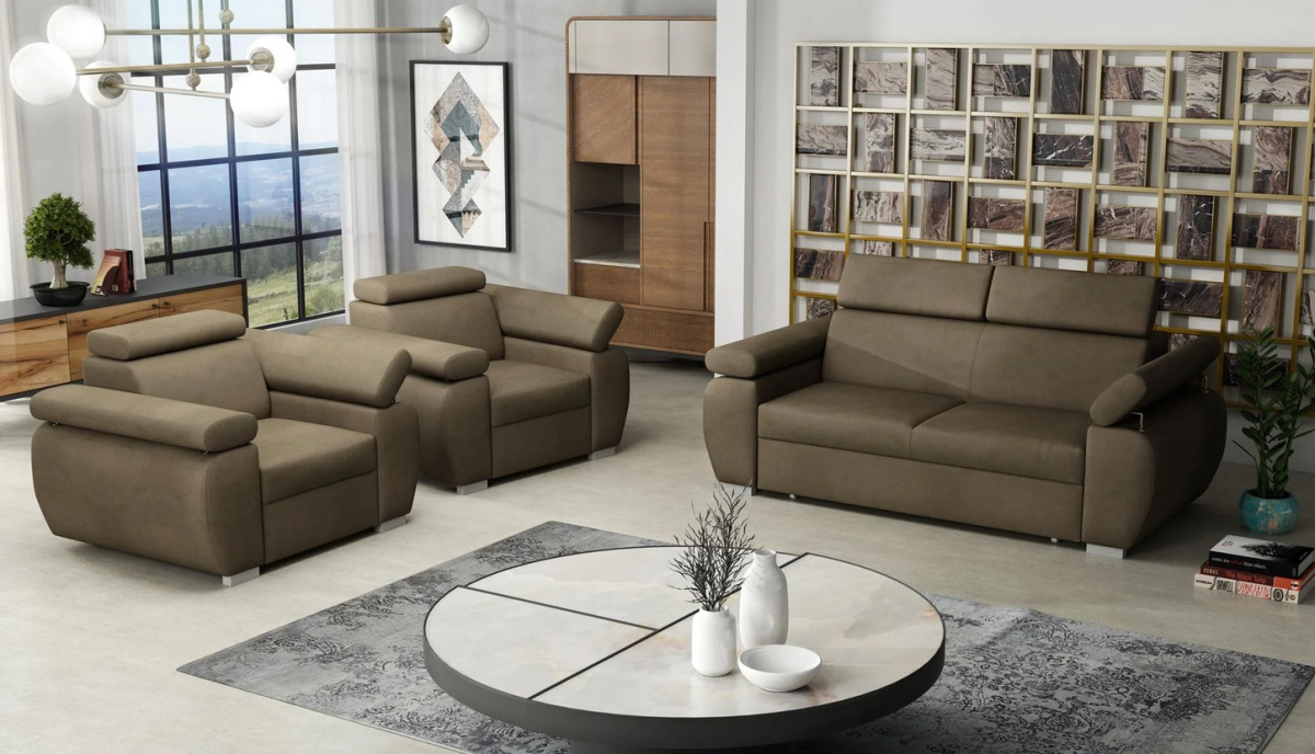 Sedací souprava Bodie je vyrobena v jednoduchém elegantním designu, který se hodí do všech interiérů. Sedací souprava je potažena kvalitní látkou Paros, která je sametově hebká a nežmolkovatí. Je odolná proti UV záření, takže udržuje stálost barev i při denním světle. Sedací soupravu nabízíme v několika odstínech této látky. Výplň sedáků tvoří kombinace vlnitých pružin s kvalitní HR pěnou. Pro pohodlí při sezení a odpočinku, je sedací souprava vybavena polohovacími opěrkami hlavy. Cena je uvedena za sestavu 3+1+1. Vyobrazené doplňky a dekorace nejsou v ceně. Zobrazení barev na fotografii se může od skutečnosti lišit.