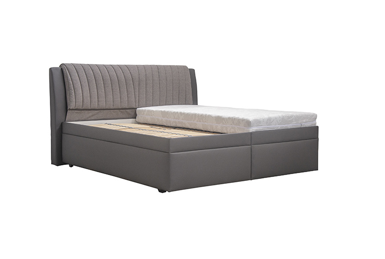 Moderní postel s efektním velmi příjemným čelem, které má odnímatelný potah. Součástí postele je přehoz s dekorativními polštářky. Základem lůžka je 28 lamelový rošt s mechanickým polohováním hlavy a nohou (7 poloh hlavy, 1 poloha nohou), s nastavením tuhosti lamel a s popruhem proti přetížení. Rošt se skládá z 28 lamel uložených ve výkyvných kaučukových pouzdrech. Snadnější manipulaci při otevírání úložného prostoru zajišťují plynové písty. K posteli je možný výběr volně ložených matrací. Matrace není součástí postele. Součástí postele je úložný prostor, který se otevírá od nohou (pomocí plynových pístů). Tuto postel nabízíme také v rozměru 180x200 cm. Zboží je dodáváno v demontu.