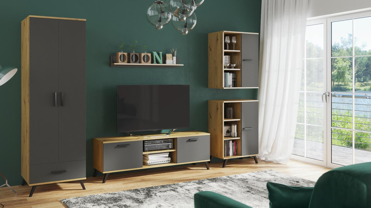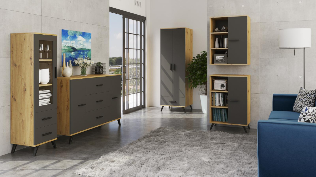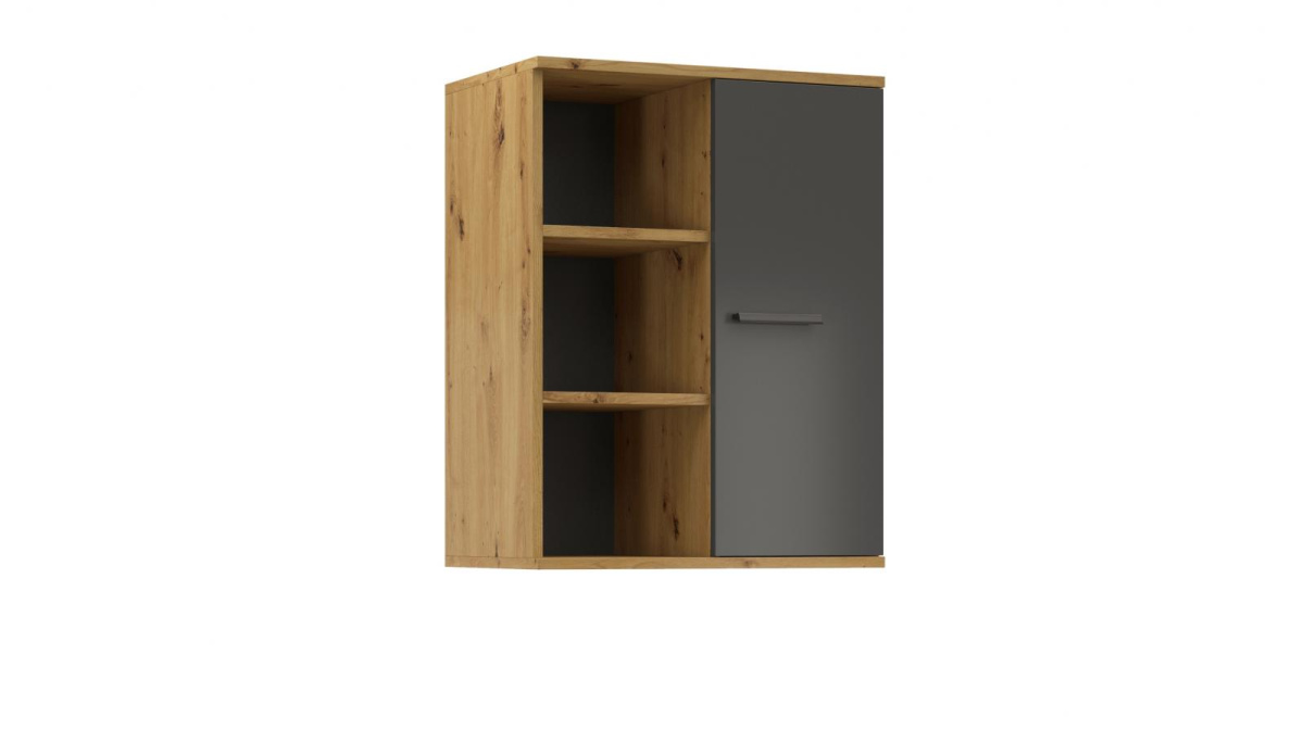 Závěsná skříňka Roky 3 Grafit je vyrobena z lamina v krásném dekoru grafit a dub artisan. Lamino tloušťky 18 mm je odolné a je zakončeno lištou ABS. Jistě oceníte i snadnou údržbu. Skříňka má nastavitelné panty a je velmi praktická. Kombinace dvířek a polic pojme vše potřebné. Rukojeť v dekóru dřeva je vyrobena z plastu. Je dodávána v demontu. Součástí balení je montážní návod včetně všech spojovacích prvků.
