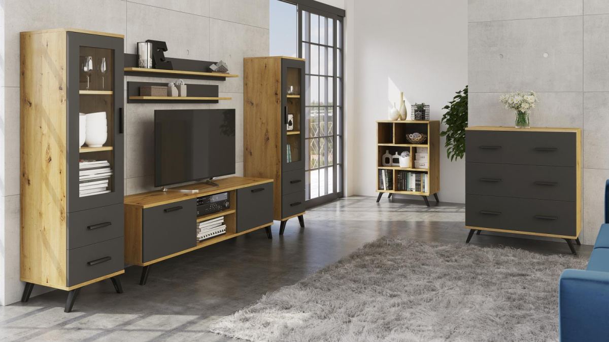 Skříň Roky 11 Grafit je vyrobena z lamina v krásném dekoru grafit a dub artisan. Lamino tloušťky 18 mm je odolné a je zakončeno lištou ABS. Jistě oceníte i snadnou údržbu. Skříň pojme vše potřebné a ve spodní části má také dva šuplíky. Rukojeti v dekóru dřeva jsou vyrobeny z plastu. Je dodávána v demontu. Součástí balení je montážní návod včetně všech spojovacích prvků.