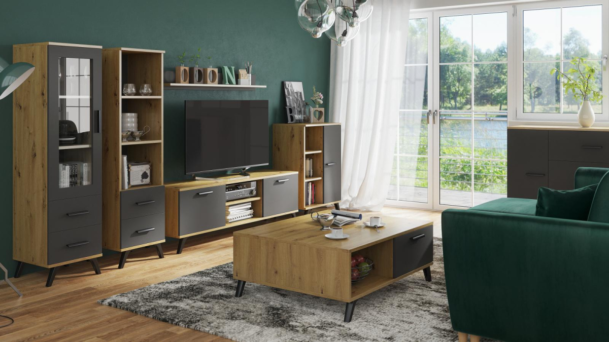 Roky Grafit je moderní bytová sestava v kombinaci 2 módních barev, grafit a dub artisan. Je vyrobena z vysoce kvalitní laminované dřevotřísky tloušťky 18 mm, odolné vůči poškrábání, vlhkosti a vysokým teplotám. Všechny hrany jsou opatřeny ABS lištou, která zajistí trvanlivost a odolnost proti nárazu. Díky této bytové stěně budete mít pohodlný i praktický interiér a také útulné a bezpečné prostředí, ve kterém se každý bude cítit dobře. Veškeré díly, které tato sestava obsahuje, si můžete objednat samostatně. Všechny prvky této sestavy jsou dodávány v demontu. Součástí je montážní plánek včetně všech potřebných spojovacích materiálů. Vyobrazené dekorace nejsou v ceně.