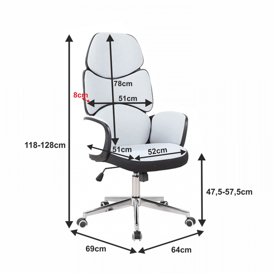 Moderní kancelářské křeslo DELIZ Barva: bílá / černá / chrom Materiál: látka / plast / chrom Rozměry (ŠxHxV): 64x69x118 / 128 cm Výška sedu: 47,5 / 57,5 cm Hloubka sedu: 46,5 Nosnost: 100kg Opěrka zad (ŠxV): 51x78 cm Sedadlo (ŠxHxV): 52x51x47,5 cm Dodávané v demontu.