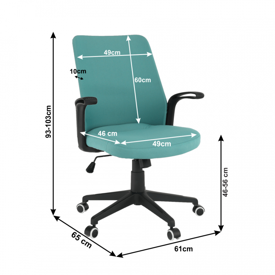 Kancelářské křeslo BADER Materiál: látka / plast Barva: mentol / černá Rozměry (ŠxHxV): 61x65x93-103 cm Čalounění: látka Hmotnost: 10kg Nosnost: 100kg Houpací mechanismus: Ano Nastavitelná výška: Ano Opěrka zad (ŠxV): 49x60 cm Sedadlo (ŠxHxV): 49x49x46 cm Dodávané v demontu