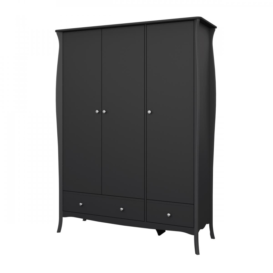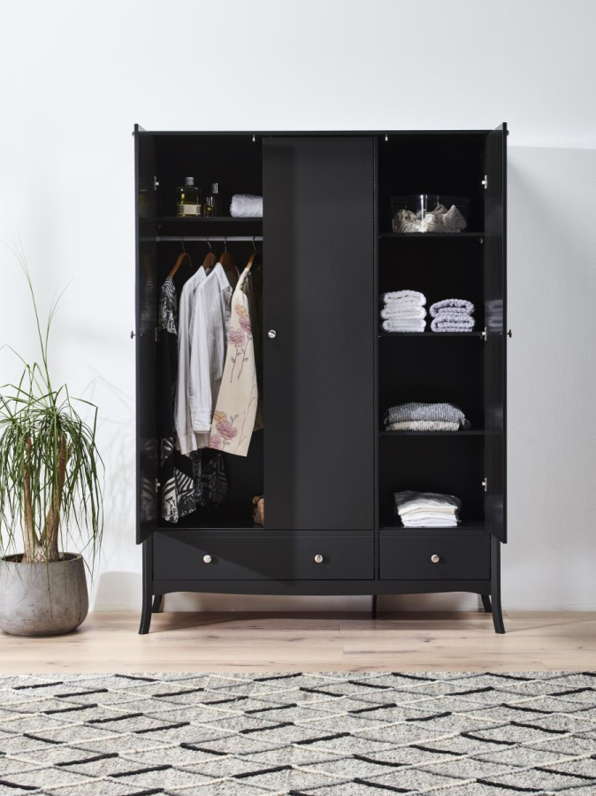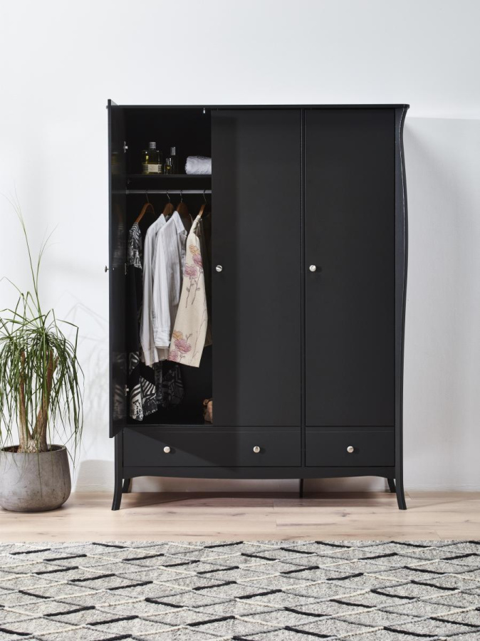 Půvabná série Baroneta dánského výrobce je charakteristická detailními ornamenty a harmonickými tvary s náznakem skandinávského minimalismu. Výrazným prvkem nábytku inspirovaným barokním stylem jsou zakřivené nohy, které přispívají ke stylovému a elegantnímu designu interiéru. Série vyrobená z kvalitních MDF desek obsahuje noční, toaletní stolky, komody a šatní skříně ve více barevných variantách. Tato prostorná šatní skříň je vybavena 2 zásuvkami, policemi a šatní tyčí. Zboží je dodáváno v demontu, součástí je schematický návod na montáž.