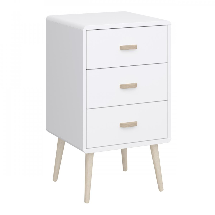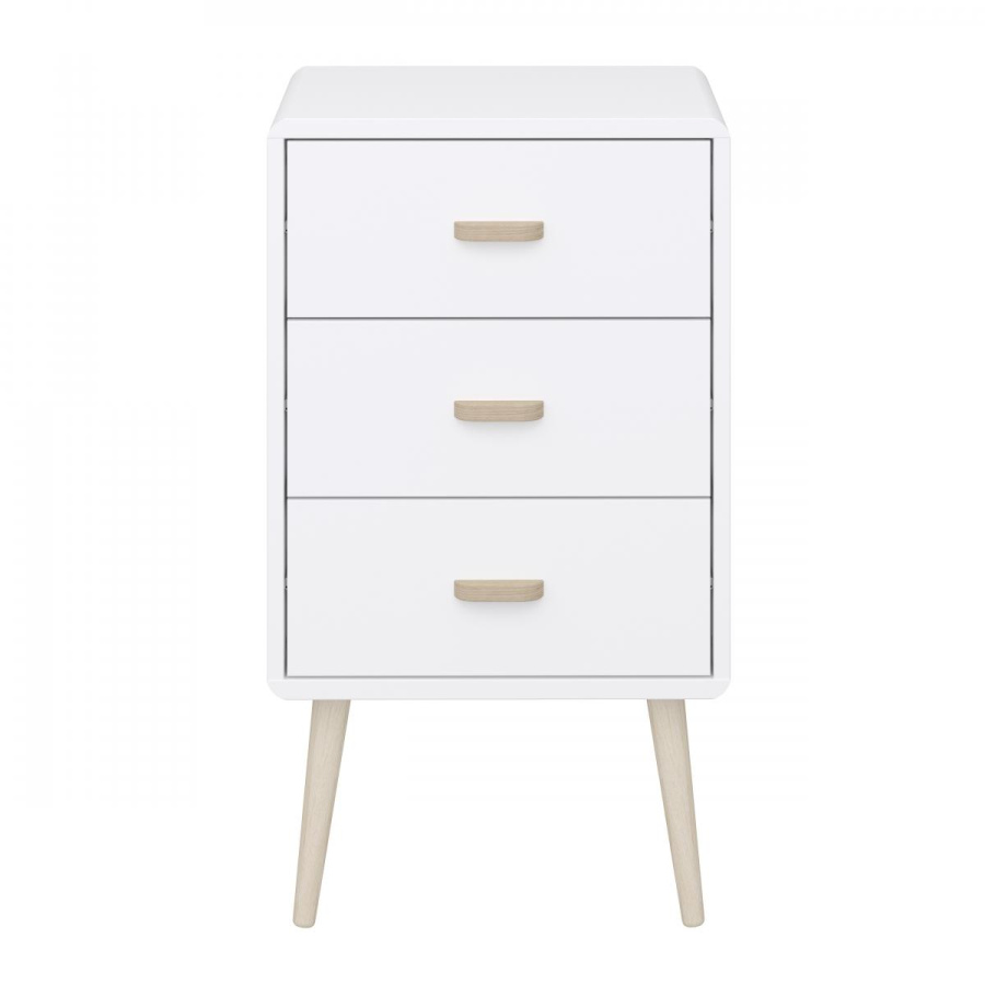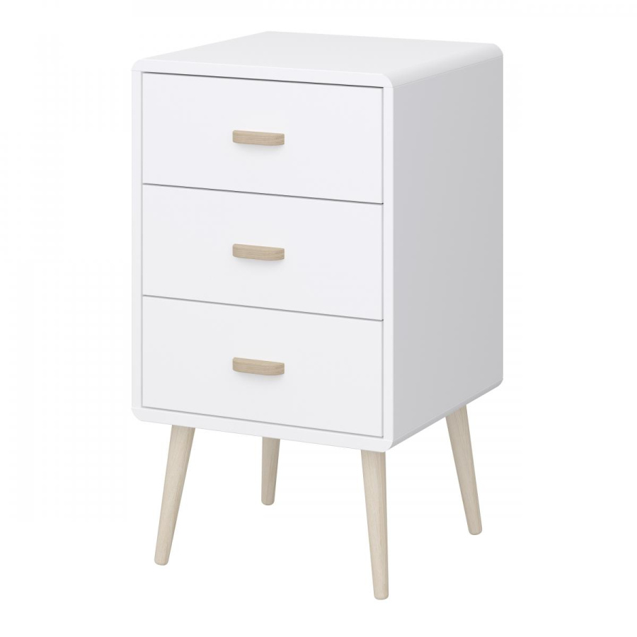 Série Miva dánského výrobce je moderní a stylová řada jasně inspirovaná severským minimalismem. Nábytek vyjadřuje jemnost, styl a klasickou eleganci díky širokým dubovým úchytkám a kulatým nožkám ze stejného materiálu. Sortiment této řady vyrobené z odolného MDF dřeva tvoří komody, noční stolky, botník a také stůl ve stejně vkusném designu. Zboží je dodáváno v demontu, součástí je schematický návod na montáž.