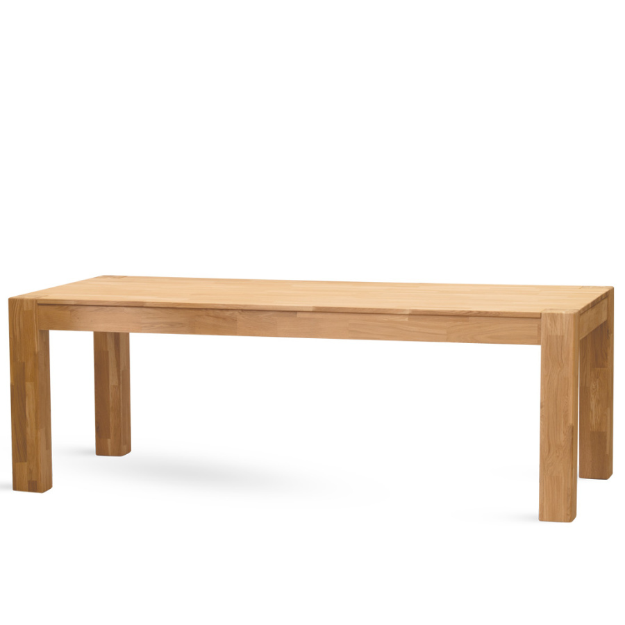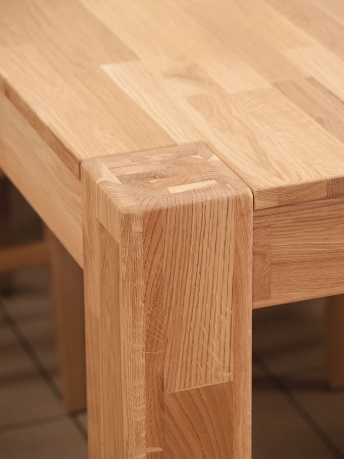 Jídelní stůl z dubového masivu. Konstrukce s nohami přiznanými v rozích. Deska je vyrobena technologií "cink spárovka" - vynikne tak odstínová rozmanitost materiálu dub masiv.
