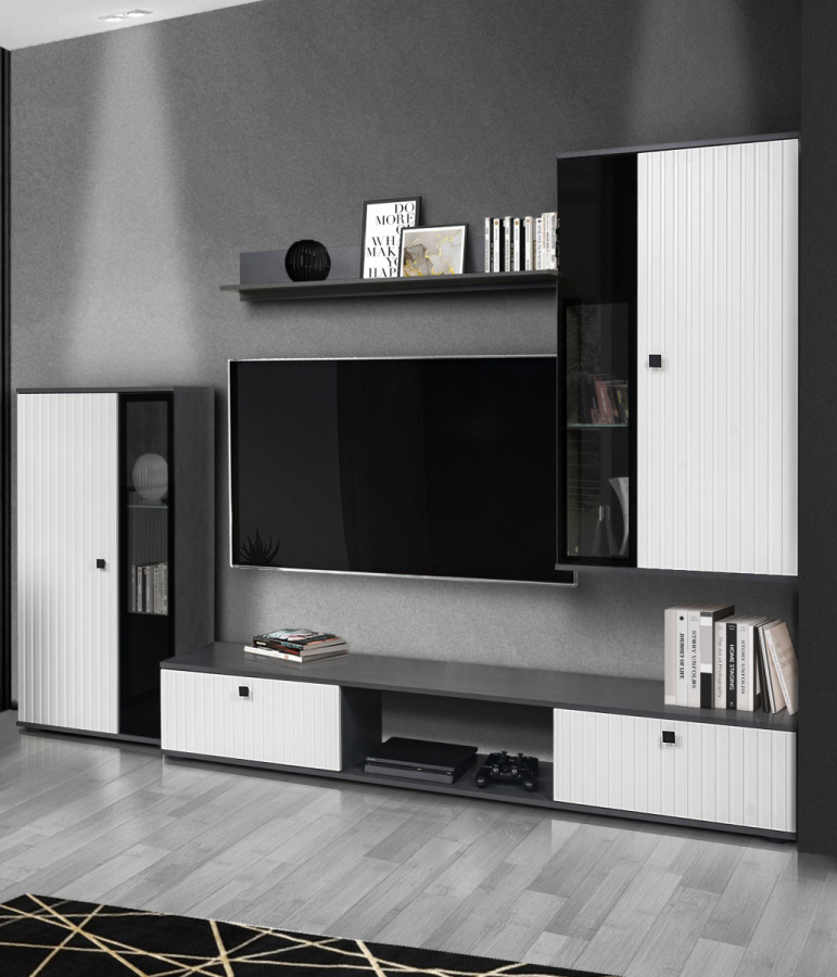 Obývací stěna Silos patří mezi oblíbené modely moderního nábytku. Nabízí dostatek úložného prostoru a je vhodná i do menších pokojů. Stěna je vyrobena z lamina, které je odolné a snadné na údržbu. Ke stěně nabízíme i komodu ve stejném provedení. Všechny prvky této sestavy jsou dodávány v demontu. Součástí je montážní plánek včetně všech potřebných spojovacích materiálů. Cena je uvedena za bytovou stěnu vyobrazenou na úvodní fotografii, bez komody, doplňků a dekorací. LED osvětlení není v ceně sestavy (lze dokoupit zvlášť). Rozměry: š.240 cm / v.180 cm / hl.40 cm