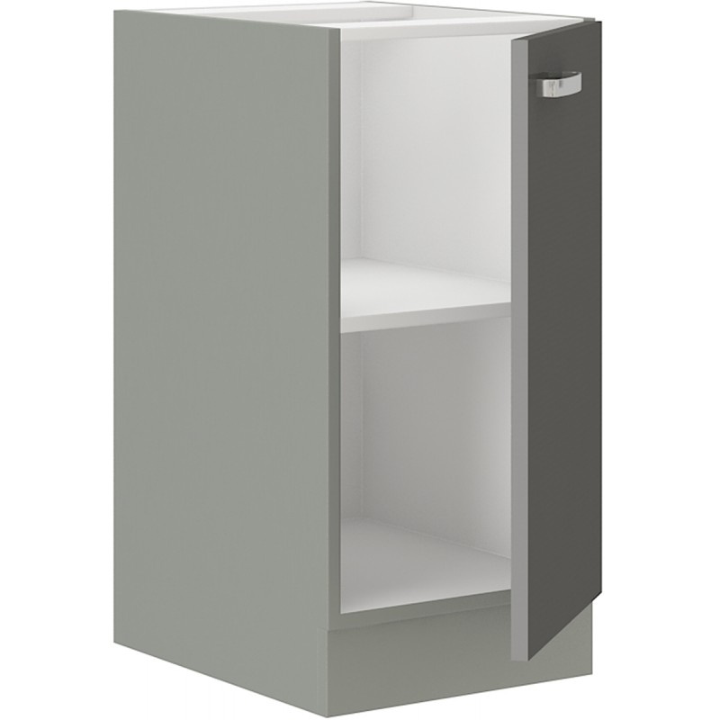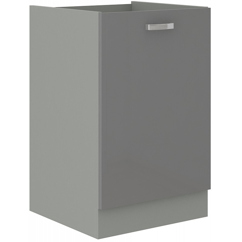 Spodní kuchyňská skříňka je vyrobena z lamina tloušťky 16 mm šedé lesklé barvy. Korpus skříňky je v šedém provedení. Vnitřek skříňky je tvořen jednou praktickou policí. Dvířka mají kovové úchytky a lze je namontovat horizontálně nebo vertikálně (délka 135mm). Dále jsou dvířka vybavena systémem tichého zavírání. Skříňka je vyrobena z kvalitních MDF desek. Poskládejte si z naší bohaté nabídky skříněk moderní a designovou kuchyň podle Vašich představ. Skříňka je dodávaná v demontu. Součástí je montážní plánek včetně všech potřebných spojovacích materiálů.