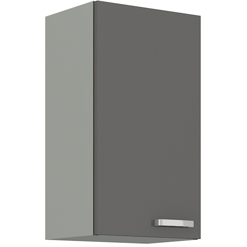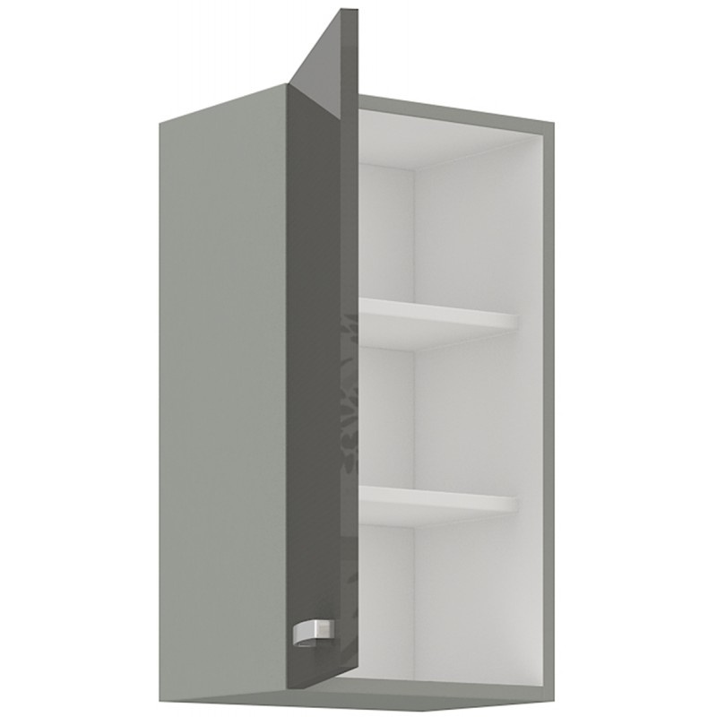 Kuchyňská skříňka je vyrobena z lamina tloušťky 16 mm šedé lesklé barvy. Korpus skříňky je v šedém provedení a vnitřek skříňky má bílou barvu. Skříňka je vyrobena z kvalitních MDF desek a uvnitř najdete dvě police, které poskytnou dostatek místa. Skříňka má kovový úchyt (délka 135mm) a dvířka jsou vybavena systémem tichého zavírání. Poskládejte si z naší bohaté nabídky skříněk moderní a designovou kuchyň podle Vašich představ. V doplňkových fotografiích najdete pro inspiraci fotky kuchyní, které jsou z těchto skříněk sestaveny. Skříňka je dodávaná v demontu. Součástí je montážní plánek včetně všech potřebných spojovacích materiálů.