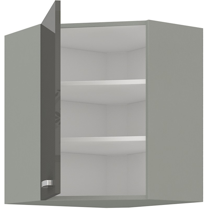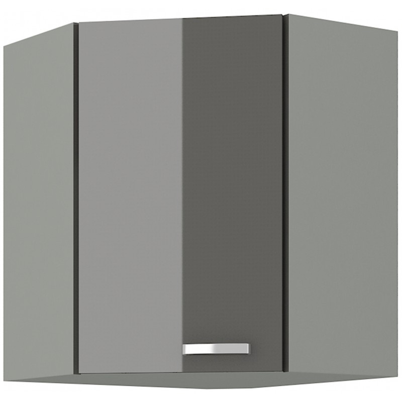 Tato elegantně zkosená horní kuchyňská skříňka dodá Vaší kuchyni jiskru a šmrnc. Je vyrobena z lamina tloušťky 16 mm šedé lesklé barvy. Korpus skříňky je v šedém provedení. Skvěle doplní další kuchyňský nábytek z této série a ve Vaší kuchyni nesmí chybět. Skříňka je vyrobena z kvalitních MDF desek a dvě vnitřní police Vám poskytnou dostatek úložného prostoru. Skříňka má kovový úchyt (délka 135mm) a dvířka jsou vybavena systémem tichého zavírání. Poskládejte si z naší bohaté nabídky skříněk moderní a designovou kuchyň podle Vašich představ. Skříňka je dodávaná v demontu. Součástí je montážní plánek včetně všech potřebných spojovacích materiálů.