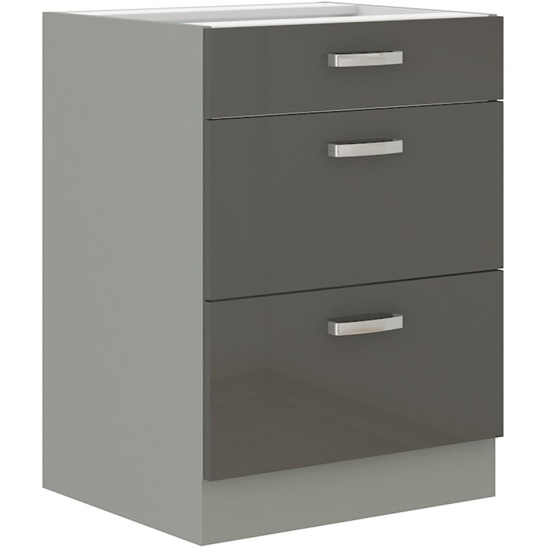 Spodní kuchyňská skříňka je vyrobena z lamina tloušťky 16 mm šedé lesklé barvy. Korpus skříňky je v šedém provedení. Skříňka je tvořena jednou nižší a dvěmi vyššími policemi s kovovými úchytky. Lze je namontovat horizontálně nebo vertikálně (délka 135mm). Dále jsou dvířka vybavena systémem tichého zavírání. Skříňka je vyrobena z kvalitních MDF desek. Poskládejte si z naší bohaté nabídky skříněk moderní a designovou kuchyň podle Vašich představ. Skříňka je dodávaná v demontu. Součástí je montážní plánek včetně všech potřebných spojovacích materiálů.