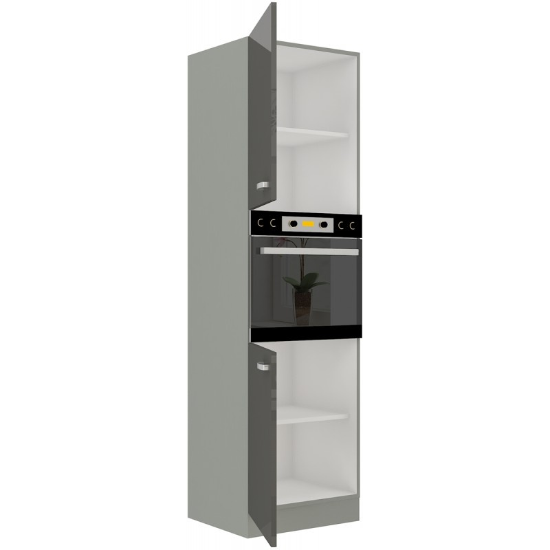 Vysoká kuchyňská skříň je určena pro vestavěnou mikrovlnou troubu. Vrchní i spodní skříňka má zabudovanou jednu polici. Skříň je vyrobena z lamina tloušťky 16 mm šedé lesklé barvy a bude dalším krásným kouskem ve Vaší kuchyňské sérii. Korpus skříňky je v šedém provedení. Na dvířkách jsou kovové úchytky ( délka 135mm) a dveře jsou vybaveny systémem tichého zavírání. Skříňka je vyrobena z kvalitních MDF desek. Poskládejte si z naší bohaté nabídky skříněk moderní a designovou kuchyň podle Vašich představ. Skříňka je dodávaná v demontu. Součástí je montážní plánek včetně všech potřebných spojovacích materiálů.