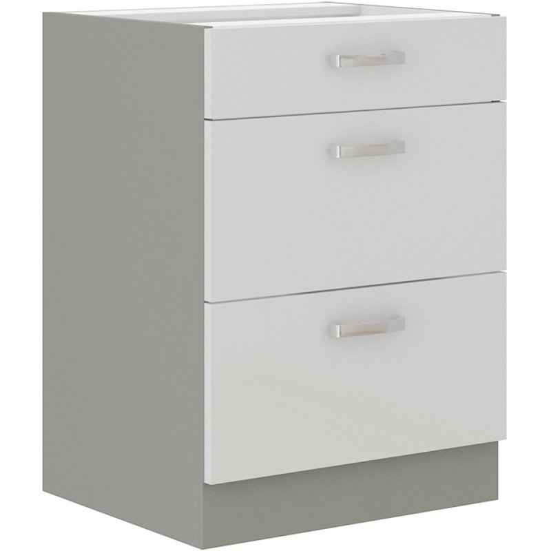 Spodní kuchyňská skříňka je vyrobena z lamina tloušťky 16 mm bílé lesklé barvy. Korpus skříňky je v šedém provedení. Tato skříňka se skládá z jedné menší a tří větších zásuvek s kovovými úchytky (délka 135mm). Skříňka je vyrobena z kvalitních MDF desek. Dvířka jsou vybavena systémem tichého zavírání. Poskládejte si z naší bohaté nabídky skříněk moderní a designovou kuchyň podle Vašich představ. Skříňka je dodávaná v demontu. Součástí je montážní plánek včetně všech potřebných spojovacích materiálů.