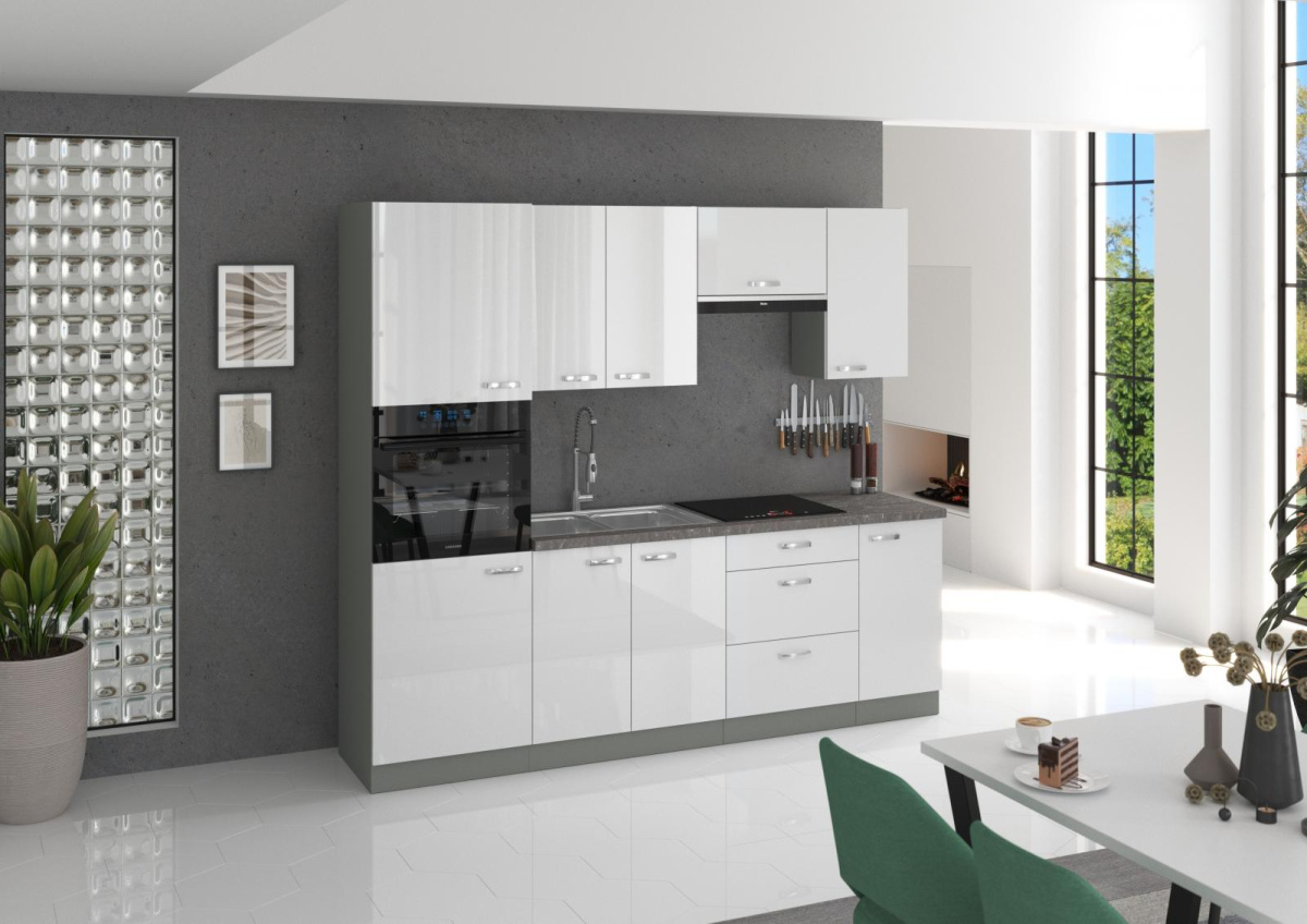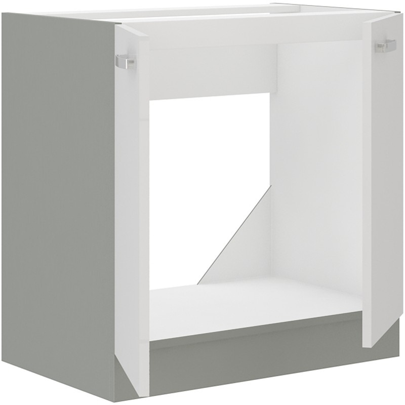 Spodní kuchyňská skříňka pod dřez je vyrobena z lamina tloušťky 16 mm bílé lesklé barvy. Korpus skříňky je v šedém provedení. Skříňka je vyrobena z kvalitních MDF desek. Skříňka má kovové úchyty (délka 135mm) a dvířka jsou vybavena systémem tichého zavírání. V doplňkových fotografiích najdete pro inspiraci fotky kuchyní, které jsou z těchto skříněk sestaveny. Poskládejte si z naší bohaté nabídky skříněk moderní a designovou kuchyň podle Vašich představ. Skříňka je dodávaná v demontu. Součástí je montážní plánek včetně všech potřebných spojovacích materiálů.