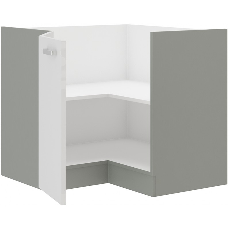Spodní rohová kuchyňská skříňka je vyrobena z lamina tloušťky 16 mm bílé lesklé barvy. Korpus skříňky je v šedém provedení. Skříňka je vyrobena z kvalitních MDF desek a uvnitř najdete jednu polici. Skříňka má kovový úchyt (délka 135mm) a dvířka jsou vybavena systémem tichého zavírání. Poskládejte si z naší bohaté nabídky skříněk moderní a designovou kuchyň podle Vašich představ. V doplňkových fotografiích najdete pro inspiraci fotky kuchyní, které jsou z těchto skříněk sestaveny. Skříňka je dodávaná v demontu. Součástí je montážní plánek včetně všech potřebných spojovacích materiálů.
