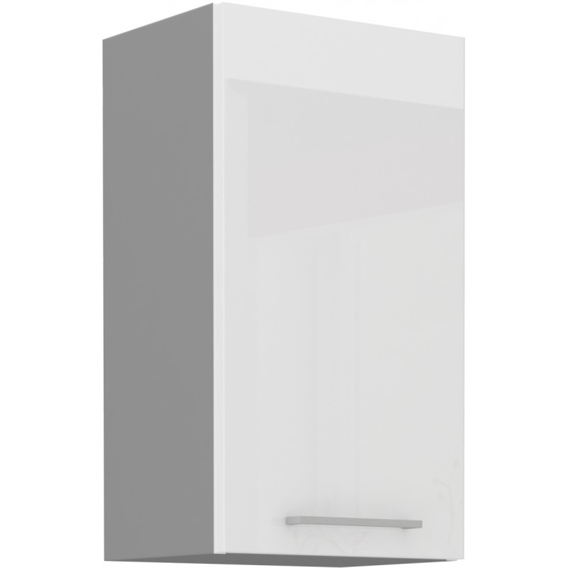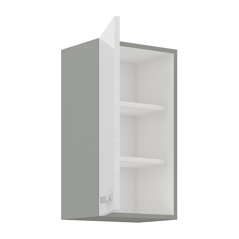 Horní kuchyňská skříňka je vyrobena z lamina tloušťky 16 mm bílé lesklé barvy. Korpus skříňky je v šedém provedení. Skříňka je vyrobena z kvalitních MDF desek s kovovým úchytem (délka 135mm). Vnitřek skříňky je vybaven dvěmi policemi, které Vám poskytnou dostatek místa k uskaldnení všeho, co budete v kuchyni potřebovat. Dvířka jsou vybavena systémem tichého zavírání. Poskládejte si z naší bohaté nabídky skříněk moderní a designovou kuchyň podle Vašich představ. Skříňka je dodávaná v demontu. Součástí je montážní plánek včetně všech potřebných spojovacích materiálů.