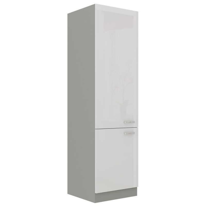 Tato vysoká kuchyňská skříň určená pro vestavěnou lednici a mrazák je vyrobena z lamina tloušťky 16 mm bílé lesklé barvy a skvěle vám doplní kuchyňskou sérii. Korpus skříňky je v šedém provedení. Na dvířkách jsou kovové úchytky ( délka 135mm). Dveře jsou vybaveny systémem tichého zavírání. Lednice nesmí být vyšší než 177cm. Dolní část skříně je určena pro mrazák, který nesmí být vyšší než 71cm.