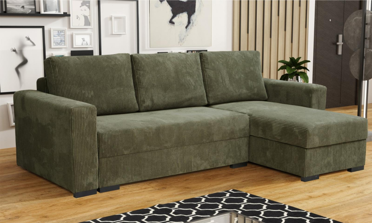 Loreta Premium je moderní rohová sedací souprava s nadčasovým designem. Její předností je pohodlí, praktičnost a univerzální použití. Můžete si ji podle potřeby sestavit jako levou nebo pravou, což je výhoda při zařizování obývacího pokoje. Nemusíte přemýšlet do jakého rohu postavíte sedací soupravu, jednoduše ji podle potřeby přizpůsobíte. Pohodlí při sezení zajišťuje kombinace pružin faliste s kvalitní PUR pěnou a velké opěrné polštáře, které jsou odnímatelné, takže si je můžete přizpůsobit svým potřebám. Praktickou stránkou sedací soupravy je úložný prostor a možnost rozložení k občasnému přespání Vaší návštěvy. Sedací souprava je potažena jednobarevnou látkou Poso, která se vyznačuje sametově jemným povrchem a svým typickým vzhledem připomíná manšestr. V nabídce najdete více barevných variant. V ceně sedací soupravy jsou 3 velké opěrné polštáře. Ostatní vyobrazené dekorace nejsou v ceně.