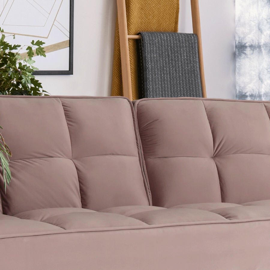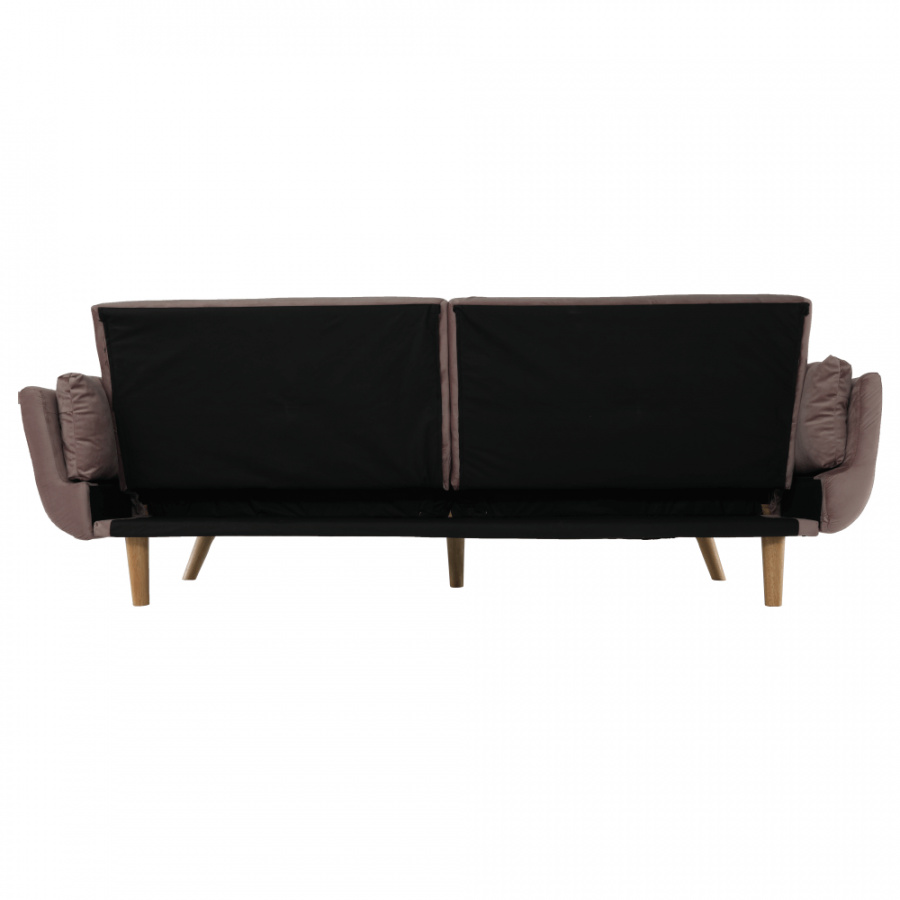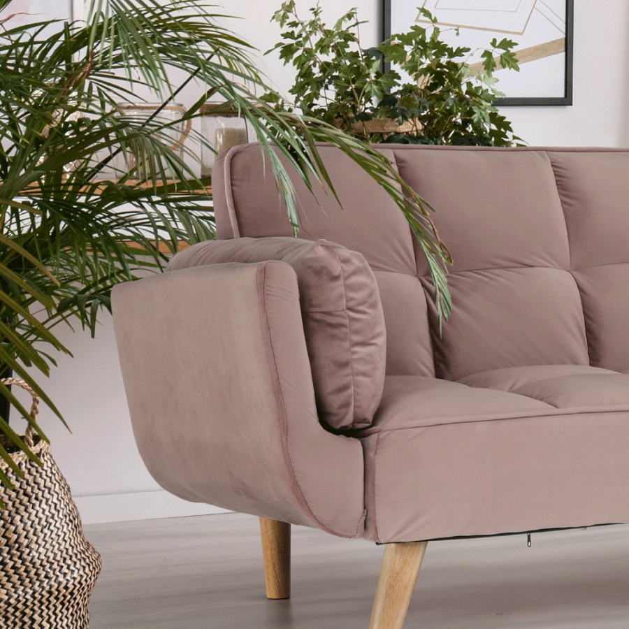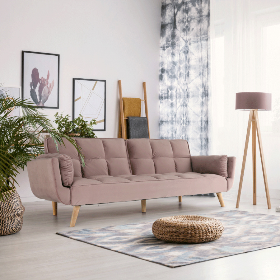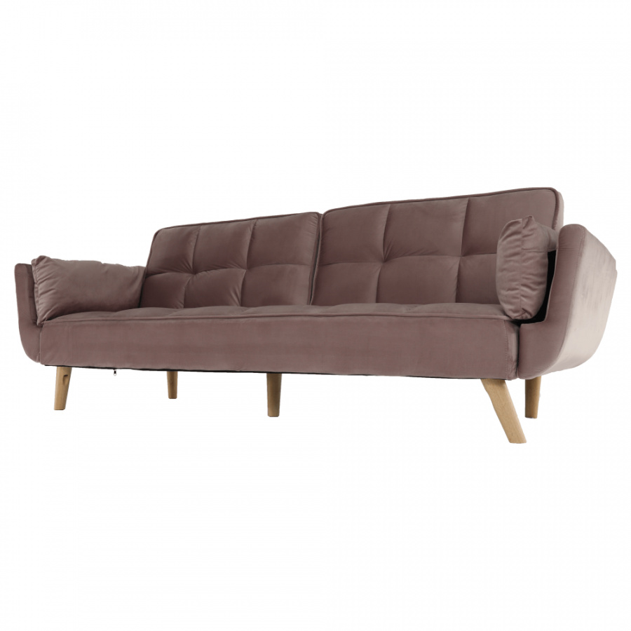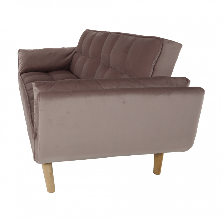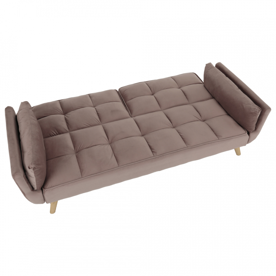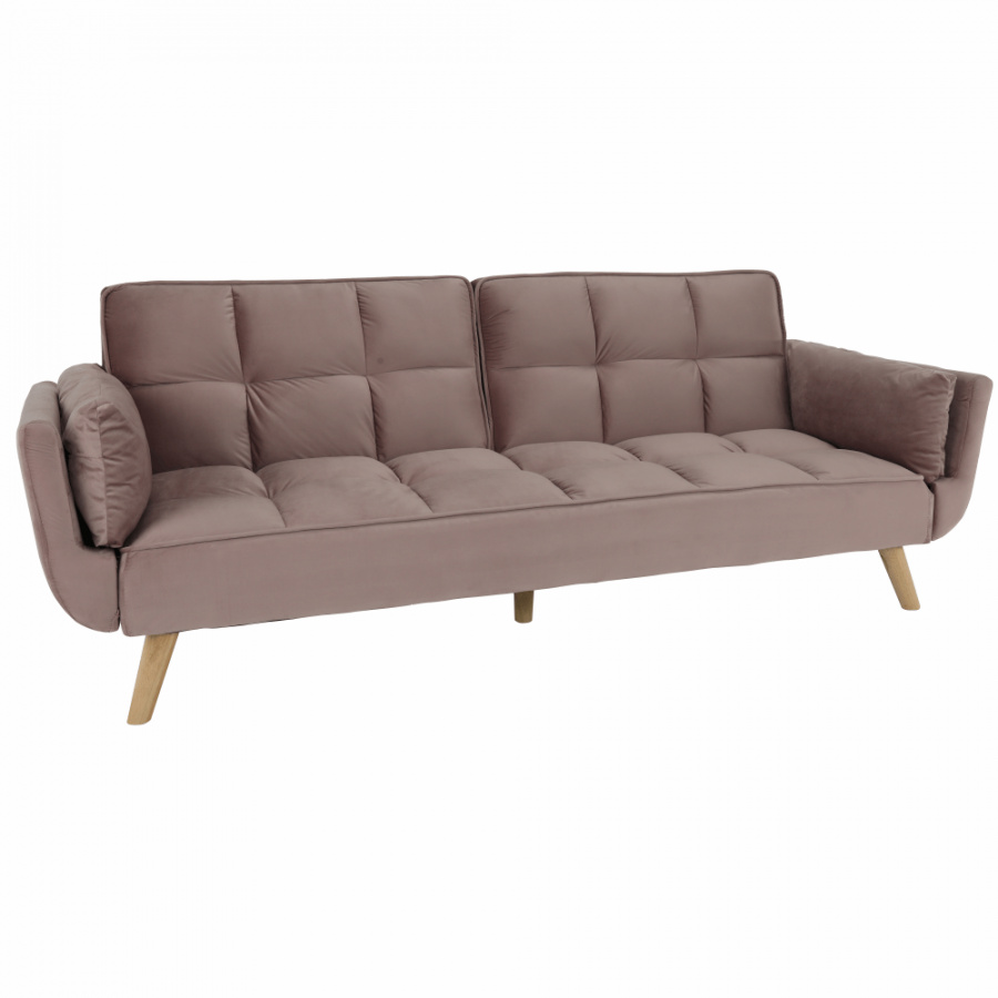 Rozkládací pohovka KAPRERA Materiál: látka Velvet / dřevo Barva: starorůžová / buk Rozměry (ŠxHxV): 213x81x77 cm Plocha na spaní (ŠxD): 166x109 cm Výška spodního prostoru od podlahy: 18,5 cm Výška sedu: 40 cm Hloubka sedu: 48 cm Dodávané v demontu.