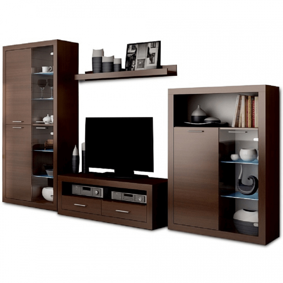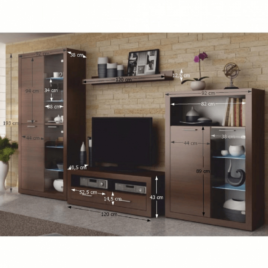 obývací stěna s LED osvětlením /bílé podbarvení/, materiál: DTD laminovaná, provedení: kaštan, rozměry ŠxVxH: 304x194x48 cm. Tloušťka materiálu: 16 mm . Dodáváno v demontu.