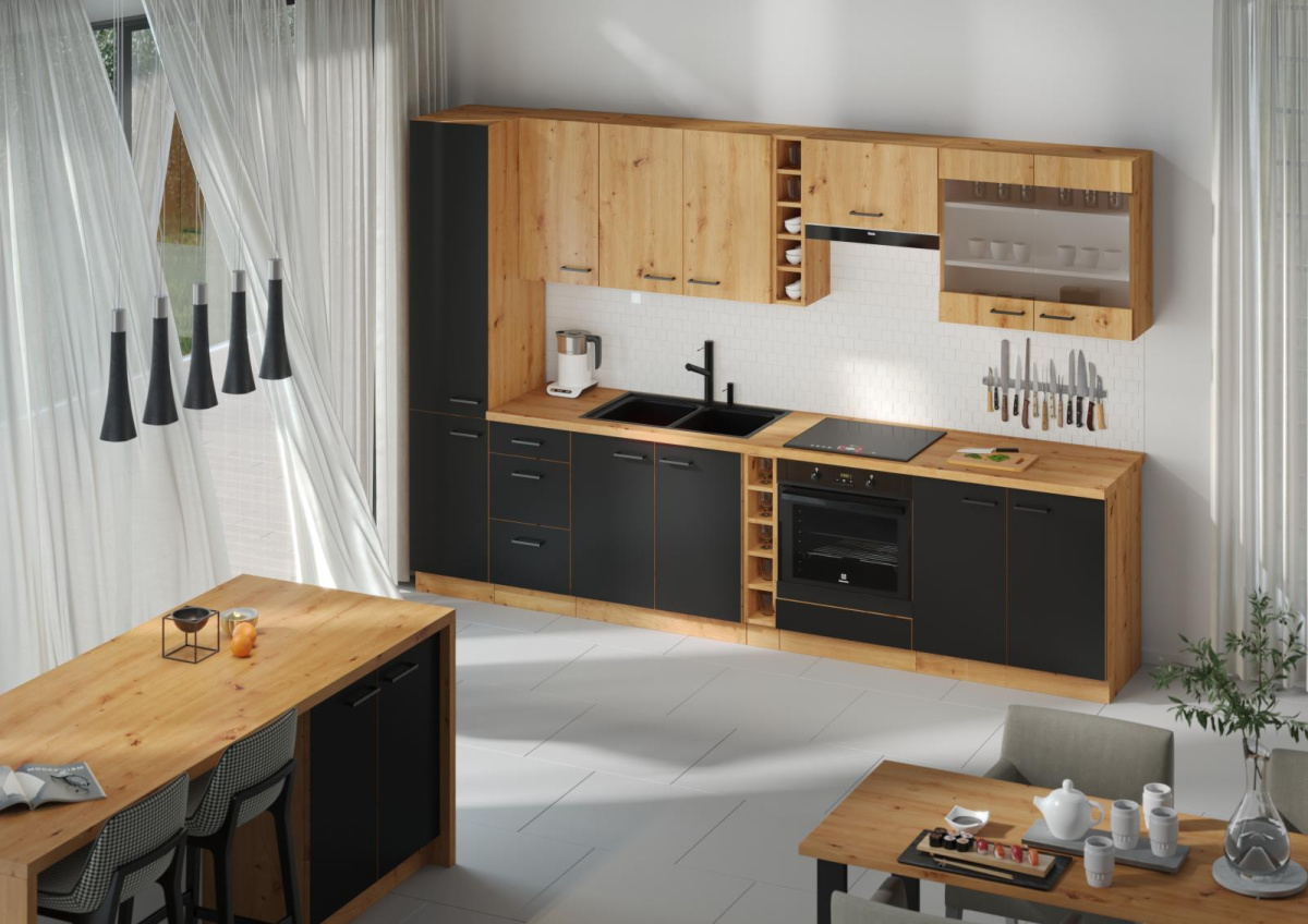 Tato spodní kuchyňská skříňka je vyrobena z lamina tloušťky 16 mm černé barvy. Korpus skříňky je v provedení dub artisan a vnitřek skříňky má bílou barvu. Skříňka je vyrobena z kvalitních MDF desek a je tvořena třemi šuplíky. Jedním nižším a dvěmi vyššími. Dvířka mají černý plastový úchyt (délka 136 mm) a jsou vybavena systémem tichého zavírání. V doplňkových fotografiích naleznete další možnosti jak si poskládat Vaši dokonalou kuchyň. Nechte se inspirovat a sestavte si z naší bohaté nabídky skříněk moderní a designovou kuchyň podle Vašich představ. Skříňka je dodávaná v demontu. Součástí je montážní plánek včetně všech potřebných spojovacích materiálů.