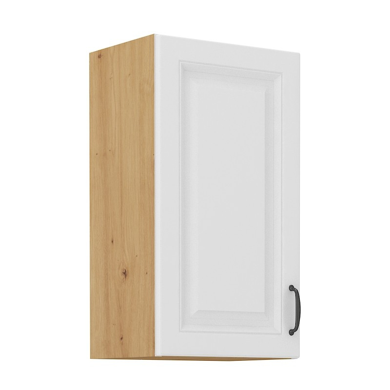 Horní kuchyňská skříňka je vyrobena z lamina tloušťky 16 mm bílé barvy. Korpus je v provedení dub artisan. Vnitřek skříňky má pak barvu bílou. Dvířka mají černý kovový úchyt (délka 124 mm). Jsou vybavena systémem tichého zavírání a při montáži si můžete zvolit pravé či levé otevírání dveří. Vnitřek skříňky obsahuje celkem dvě police, které Vám poskytnou dostatek místa k uskladnění všeho, co budete v kuchyni potřebovat. Poskládejte si z naší bohaté nabídky skříněk moderní a designovou kuchyň podle Vašich představ. Skříňka je dodávaná v demontu. Součástí je montážní plánek včetně všech potřebných spojovacích materiálů.