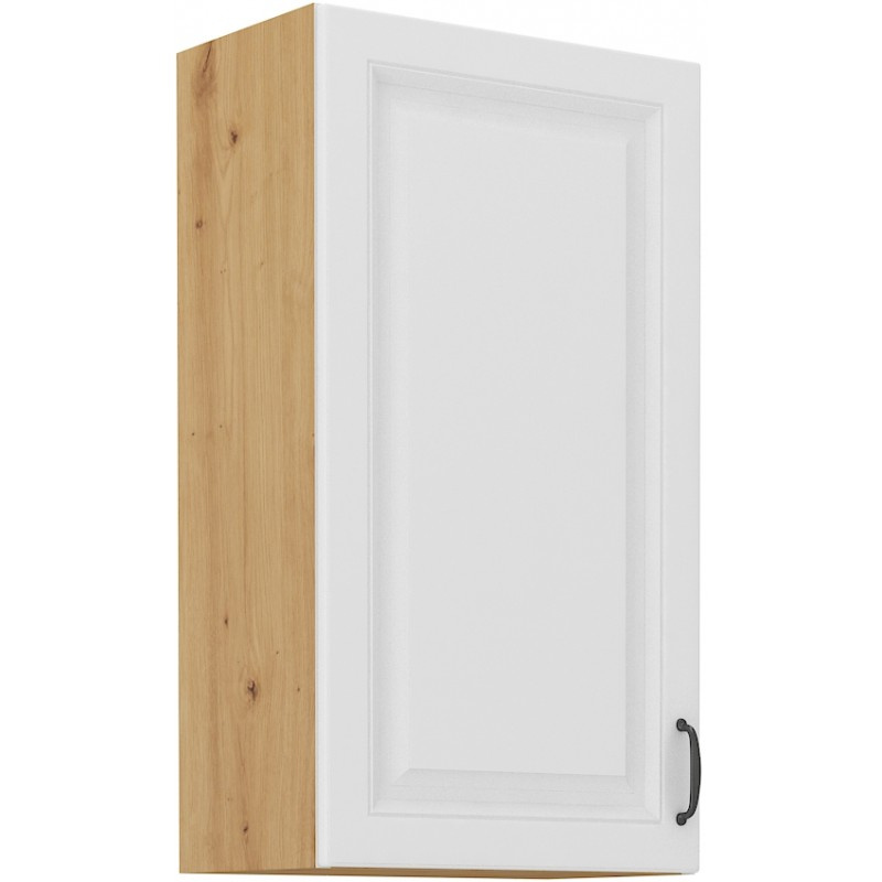 Horní kuchyňská skříňka je vyrobena z lamina tloušťky 16 mm bílé barvy. Korpus je v provedení dub artisan. Vnitřek skříňky má pak barvu bílou. Dvířka mají černý kovový úchyt (délka 124 mm). Jsou vybavena systémem tichého zavírání a při montáži si můžete zvolit pravé či levé otevírání dveří. Vnitřek skříňky obsahuje celkem tři police, které Vám poskytnou dostatek místa k uskladnění všeho, co budete v kuchyni potřebovat. V doplňkových fotografiích naleznete další možnosti a inspiraci pro sestavení Vaší vysněné chuchyně. Poskládejte si z naší bohaté nabídky skříněk moderní a designovou kuchyň podle Vašich představ. Skříňka je dodávaná v demontu. Součástí je montážní plánek včetně všech potřebných spojovacích materiálů.