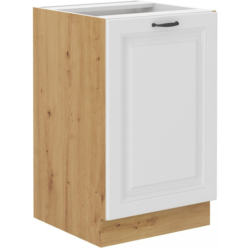 Tato spodní kuchyňská skříňka je vyrobena z lamina tloušťky 16 mm v bílé barvě. Korpus skříňky je v provedení dub artisan. Skříňka obsahuje jednu praktickou polici, která Vám poskytne dostatek místa k uložení všeho co budete potřebovat. Dvířka mají černé kovové úchytky a lze je namontovat horizontálně nebo vertikálně (délka 124mm). Dále jsou dvířka vybavena systémem tichého zavírání. Skříňka je vyrobena z kvalitních MDF desek. Poskládejte si z naší bohaté nabídky skříněk moderní a designovou kuchyň podle Vašich představ. Skříňka je dodávaná v demontu. Součástí je montážní plánek včetně všech potřebných spojovacích materiálů.