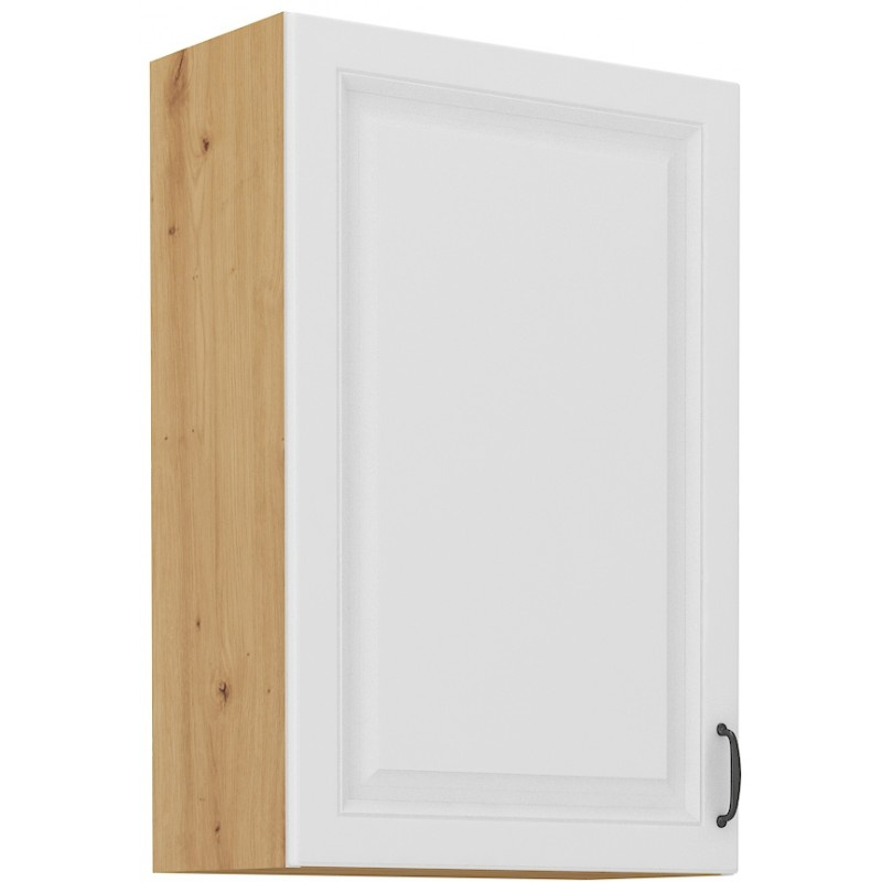 Horní kuchyňská skříňka je vyrobena z lamina tloušťky 16 mm bílé barvy. Korpus je v provedení dub artisan. Vnitřek skříňky má pak barvu bílou. Dvířka mají černý kovový úchyt (délka 124 mm). Jsou vybavena systémem tichého zavírání a při montáži si můžete zvolit pravé či levé otevírání dveří. Vnitřek skříňky obsahuje celkem tři police, které Vám poskytnou dostatek místa k uskladnění všeho, co budete v kuchyni potřebovat. V doplňkových fotografiích najdete další možnosti sestavení Vaši kuchyně. Nechte se inspirovat a poskládejte si z naší bohaté nabídky skříněk moderní a designovou kuchyň podle Vašich představ. Skříňka je dodávaná v demontu. Součástí je montážní plánek včetně všech potřebných spojovacích materiálů.