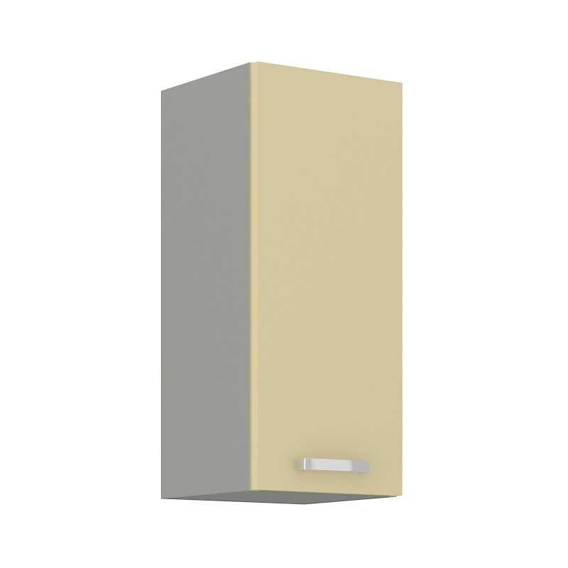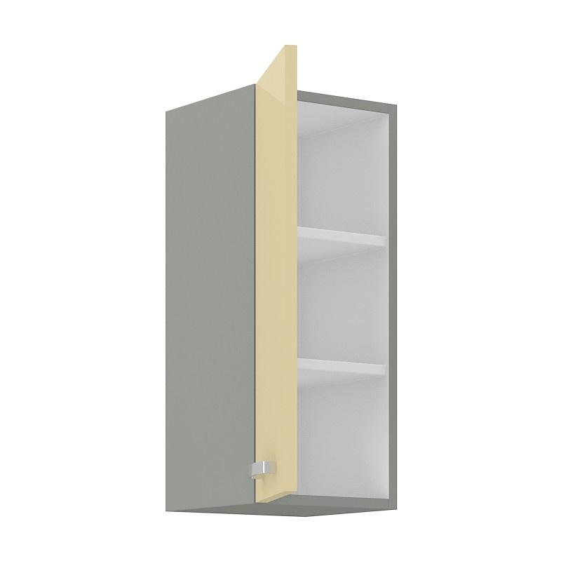 Horní kuchyňská skříňka je vyrobena z lamina tloušťky 16 mm lesklé krémové barvy. Korpus je v šedém provedení Dvířka mají lesklý kovový úchyt (délka 135 mm). Jsou vybavena systémem tichého zavírání a při montáži si můžete zvolit pravé či levé otevírání dveří. Vnitřek skříňky je v bílé barvě a obsahuje celkem dvě police, které Vám poskytnou dostatek místa k uskladnění všeho, co budete v kuchyni potřebovat. Nechte se inspirovat a poskládejte si z naší bohaté nabídky skříněk moderní a designovou kuchyň podle Vašich představ. Skříňka je dodávaná v demontu. Součástí je montážní plánek včetně všech potřebných spojovacích materiálů.
