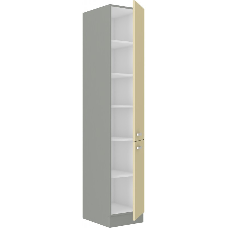 Vysoká kuchyňská skříňka je vyrobena z lamina tloušťky 16 mm lesklé krémové barvy. Koprus je v šedém provedení. Skříňka je vyrobena z kvalitních MDF desek. Dvířka mají lesklé kovové úchyty (délka 135mm) a lze je namontovat horizontálně či vertikálně. Vnitřek skříňky obsahuje celkem čtyři police, které Vám poskytnou dostatek místa k uskladnění všeho, co budete v kuchyni potřebovat. Dvířka jsou vybavena systémem tichého zavírání a při montáži si můžete zvolit pravé či levé otevírání dveří. V doplňujících fotografiích naleznete další možnosti a inspiraci k sestavení Vaší vysněné kuchyně. Poskládejte si z naší bohaté nabídky skříněk moderní a designovou kuchyň podle Vašich představ. Skříňka je dodávaná v demontu. Součástí je montážní plánek včetně všech potřebných spojovacích materiálů.