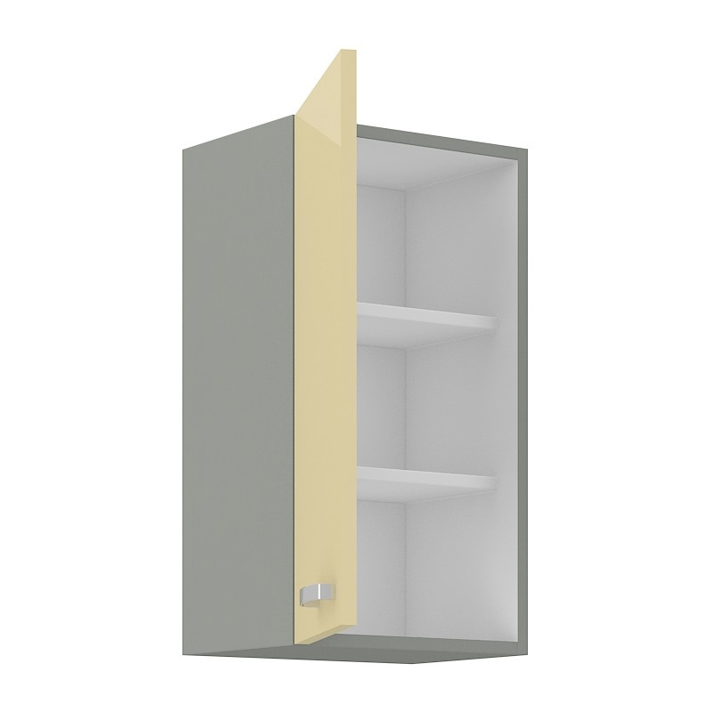 Horní kuchyňská skříňka je vyrobena z lamina tloušťky 16 mm lesklé krémové barvy. Korpus je v šedém provedení Dvířka mají lesklý kovový úchyt (délka 135 mm) a lze ho namontovat horizontálně či vertikálně. Dále jsou vybavena systémem tichého zavírání a při montáži si můžete zvolit pravé či levé otevírání dveří. Vnitřek skříňky je v bílé barvě a obsahuje celkem dvě police, které Vám poskytnou dostatek místa k uskladnění všeho, co budete v kuchyni potřebovat. V doplňujících fotografiích naleznete další možnosti k sestavení Vaší vysněné kuchyně. Nechte se inspirovat a poskládejte si z naší bohaté nabídky skříněk moderní a designovou kuchyň podle Vašich představ. Skříňka je dodávaná v demontu. Součástí je montážní plánek včetně všech potřebných spojovacích materiálů.