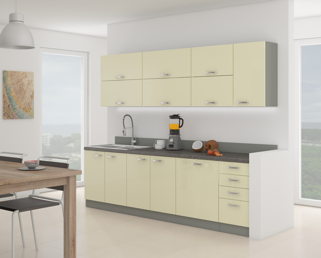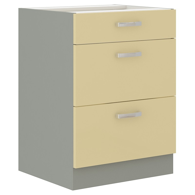 Tato spodní kuchyňská skříňka je vyrobena z lamina tloušťky 16 mm v lesklé krémové barvě. Korpus skříňky je v šedém provedení. Skříňka je tvořena jedním nižším a dvěmi vyššími šuplíky (vnitřní barva je bílá) které Vám poskytnou dostatek místa k uložení všeho co budete potřebovat. Dvířka mají lesklé kovové úchytky a lze je namontovat horizontálně nebo vertikálně (délka 135mm). Dále jsou dvířka vybavena systémem tichého zavírání. Skříňka je vyrobena z kvalitních MDF desek. V doplňkových fotografiích naleznete další možnosti a inspiraci k sestavení Vaší vysněné kuchyně. Poskládejte si z naší bohaté nabídky skříněk moderní a designovou kuchyň podle Vašich představ. Skříňka je dodávaná v demontu. Součástí je montážní plánek včetně všech potřebných spojovacích materiálů.