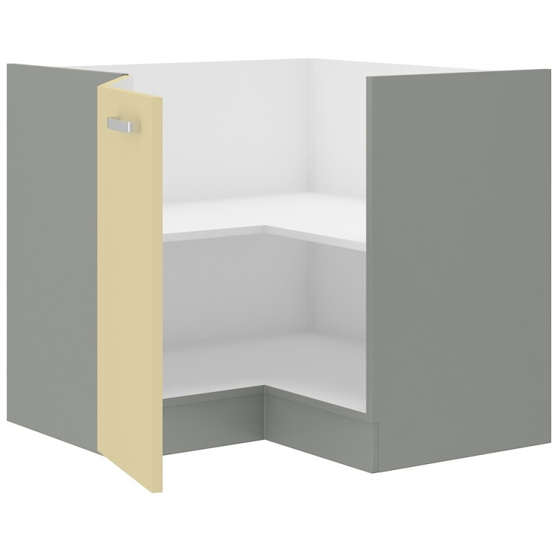 Spodní rohová kuchyňská skříňka je vyrobena z lamina tloušťky 16 mm krémové lesklé barvy. Korpus je v šedém provedení. Skříňka je vyrobena z kvalitních MDF desek a uvnitř najdete jednu polici. Dveře mají lesklý kovový úchyt (délka 135 mm) a jsou vybavena systémem tichého zavírání. Poskládejte si z naší bohaté nabídky skříněk moderní a designovou kuchyň podle Vašich představ. Skříňka je dodávaná v demontu. Součástí je montážní plánek včetně všech potřebných spojovacích materiálů.