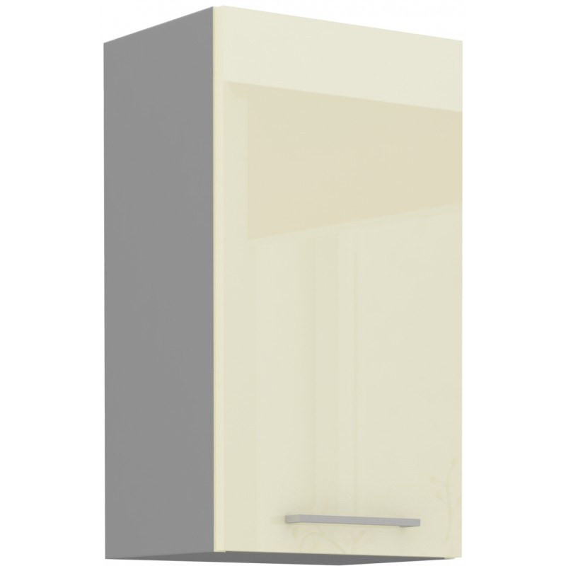 Horní kuchyňská skříňka je vyrobena z lamina tloušťky 16 mm lesklé krémové barvy. Korpus je v šedém provedení Dvířka mají lesklý kovový úchyt (délka 135 mm). Jsou vybavena systémem tichého zavírání a při montáži si můžete zvolit pravé či levé otevírání dveří. Vnitřek skříňky je v bílé barvě a obsahuje celkem dvě police, které Vám poskytnou dostatek místa k uskladnění všeho, co budete v kuchyni potřebovat. V doplňkových fotografiích naleznete další možnosti a insipraci k sestavení Vaši vysněné kuchyně. Nechte se inspirovat a poskládejte si z naší bohaté nabídky skříněk moderní a designovou kuchyň podle Vašich představ. Skříňka je dodávaná v demontu. Součástí je montážní plánek včetně všech potřebných spojovacích materiálů.