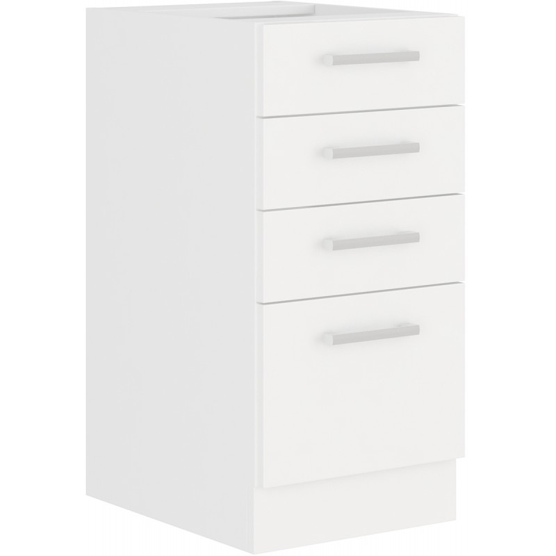 Spodní kuchyňská skříňka je vyrobena z lamina tloušťky 16 mm bílé barvy. Tato skříňka se skládá ze tří nižších a jedné vyšší zásuvky. Na ty si můžete buď horizontálně nebo vertikálně namontovat kovové či plastové úchytky (délka 140 mm). Skříňka je vyrobena z kvalitních MDF desek. Dvířka jsou vybavena systémem tichého zavírání. Poskládejte si z naší bohaté nabídky skříněk moderní a designovou kuchyň podle Vašich představ. Skříňka je dodávaná v demontu. Součástí je montážní plánek včetně všech potřebných spojovacích materiálů.