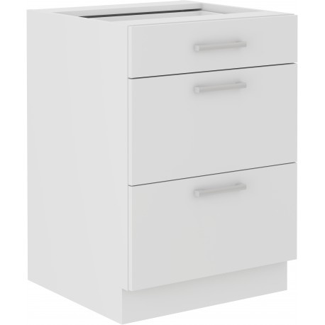 Spodní kuchyňská skříňka je vyrobena z lamina tloušťky 16 mm bílé barvy. Skříňka je složena z jedné nižší a dvěmi vyššími zásuvkami. Dvířka mají plastové nebo kovové úchytky (délka 140 mm), které lze namontovat horizontálně či vertikálně. Dále jsou dvířka vybavena systémem tichého zavírání. Skříňka je vyrobena z kvalitních MDF desek. Poskládejte si z naší bohaté nabídky skříněk moderní a designovou kuchyň podle Vašich představ. Skříňka je dodávaná v demontu. Součástí je montážní plánek včetně všech potřebných spojovacích materiálů.
